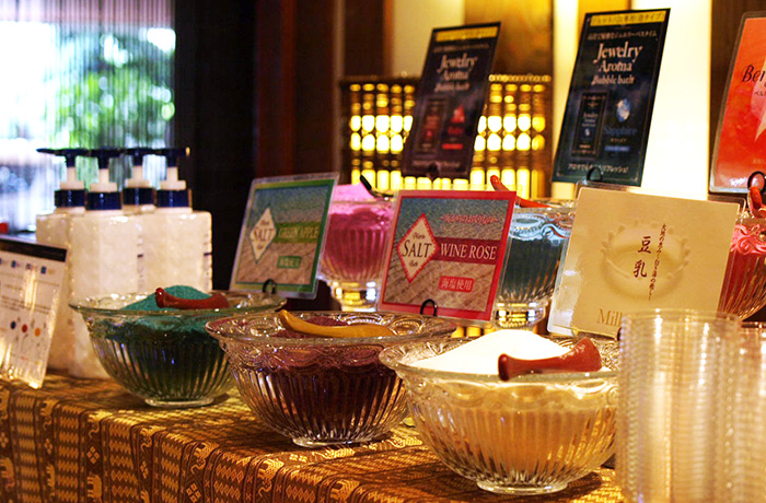 フロントロビーに、10種類の入浴剤バイキングをご用意しております。癒しのバスタイムをお楽しみ下さい。