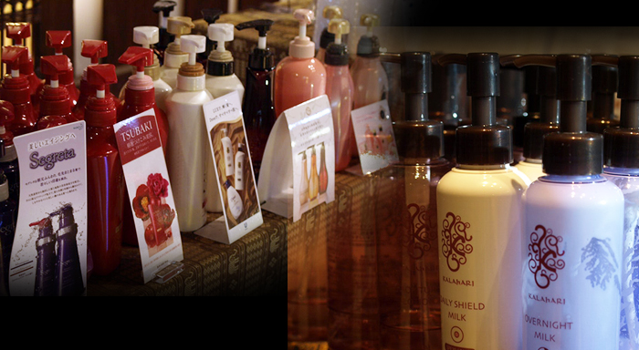 フロントロビーに、ヘアケア&スキンケアアイテムを多数ご用意しております。あなたに合ったアイテムがきっと見つかる!